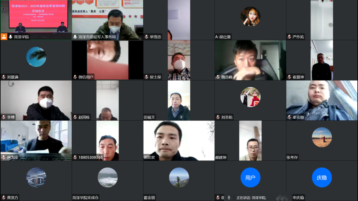 此次集中培训由市委组织部、市退役军人事务局、菏泽学院437ccm必赢国际官网共同举办,至12月23日结束,为期4天。因疫情原因,本次培训采用线上方式进行。培训按照“学用结合、按需施教、注重实效”的原则组织实施,培训内容丰富,既有党的二十大精神辅导、道德和法律知识、还有注重实操方面的心理健康、新闻和舆情处置、公文写作和菏泽历史文化和社会经济发展状况介绍等讲授,既有专家讲授,也有教学互动,学员研讨,力求通过短时间的集中培训,让参训学员学习了解更多理论和技能知识,帮助转业军转尽快适应地方工作,了解菏泽市经济社会发展的基本状况和菏泽市高质量发展的总体思路,帮助转业军官顺利实现由国防和军队建设人才向党政人才和经济社会建设人才转变,为菏泽高质量发展贡献退役军人的力量。